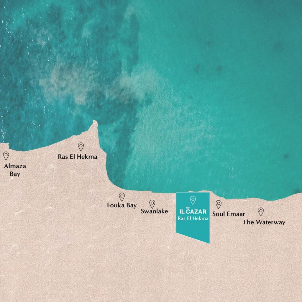 امتلك في الساحل الشمالي في صافية الكيلو 186 رأس الحكمة بجوار اعمار – سوان_ليك – قطامية_كوست